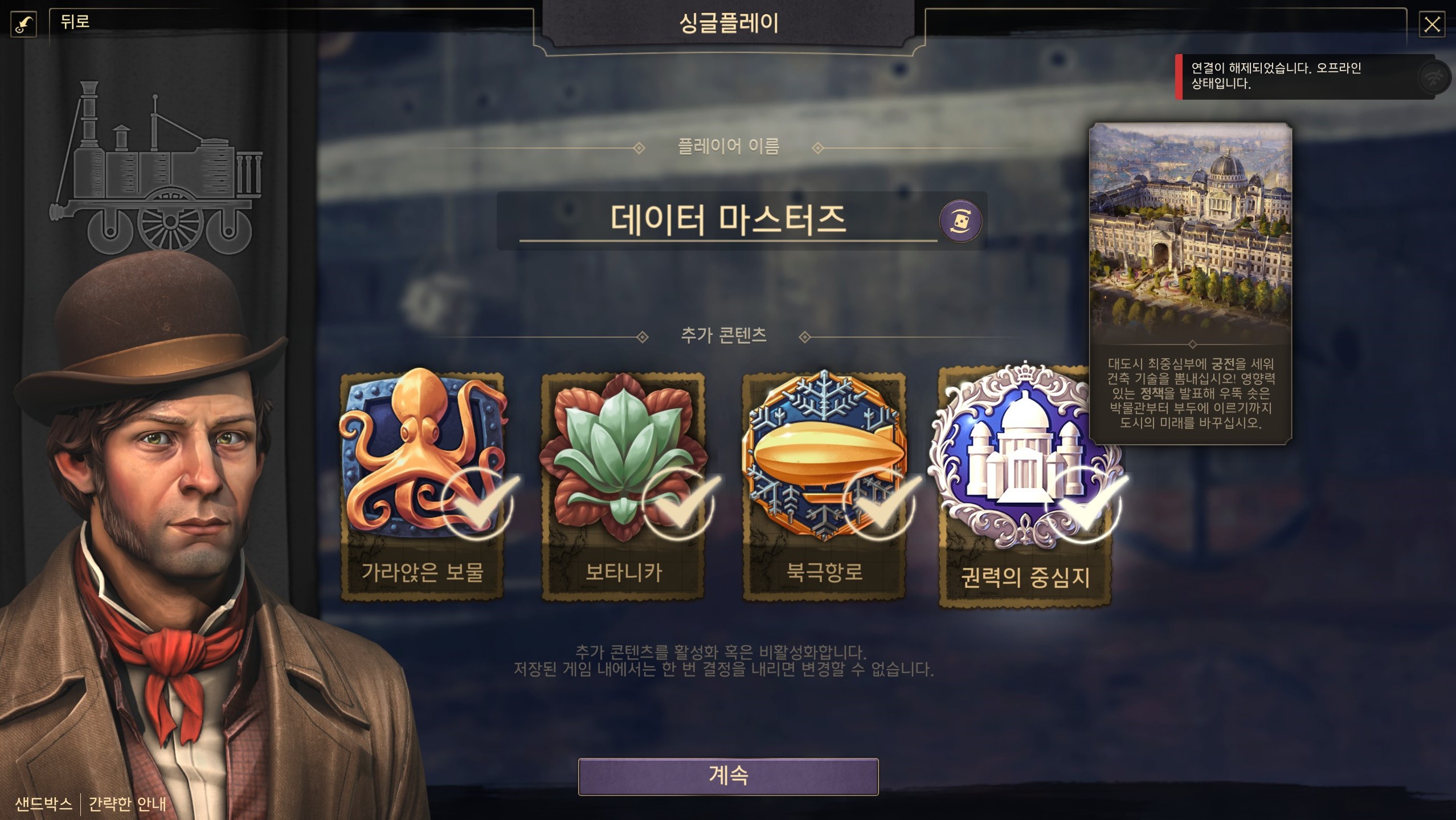 현재 모든 DLC를 선택하고, 무정부 주의자까지 선택하면 권력의 중심지가 활성화가 안되는 버그(?)가 있다. 휴고 메르시어 박사를 선택해 총 5개의 DLC를 하려는 경우, 가장 재미없고 무쓸모인 보타니카를 빼고 하도록 하자.