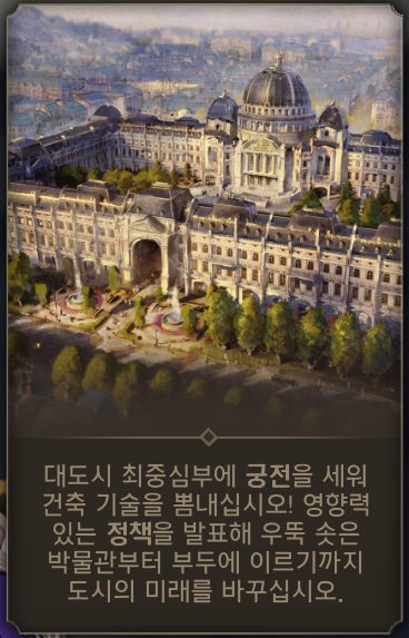 대도시 최중심부에 궁전을 세워 건축 기술을 뽐내십시오! 영향력 있는 정책을 발표해 우뚝 솟은 박물관부터 부두에 이르기까지 도시의 미래를 바꾸십시오.